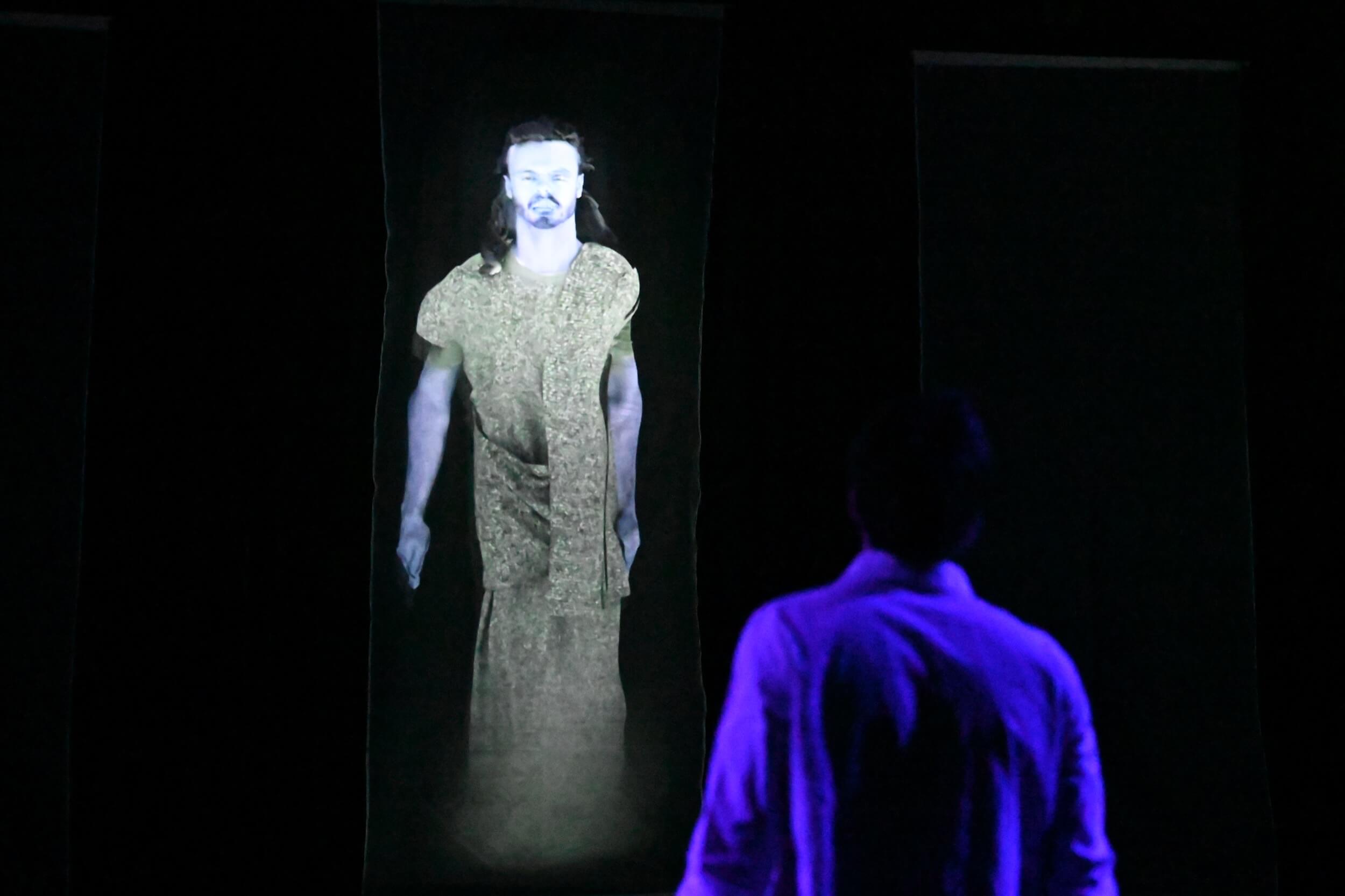 These digital ghosts tower over the stage, combining 3D scanning, modelling, animation, and projection.